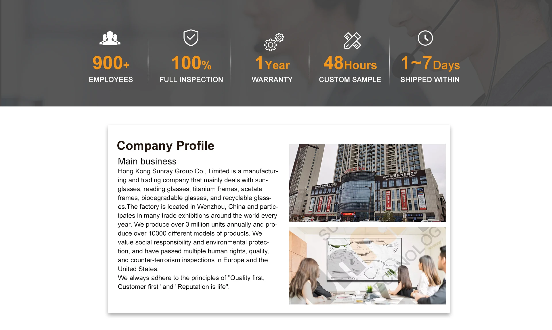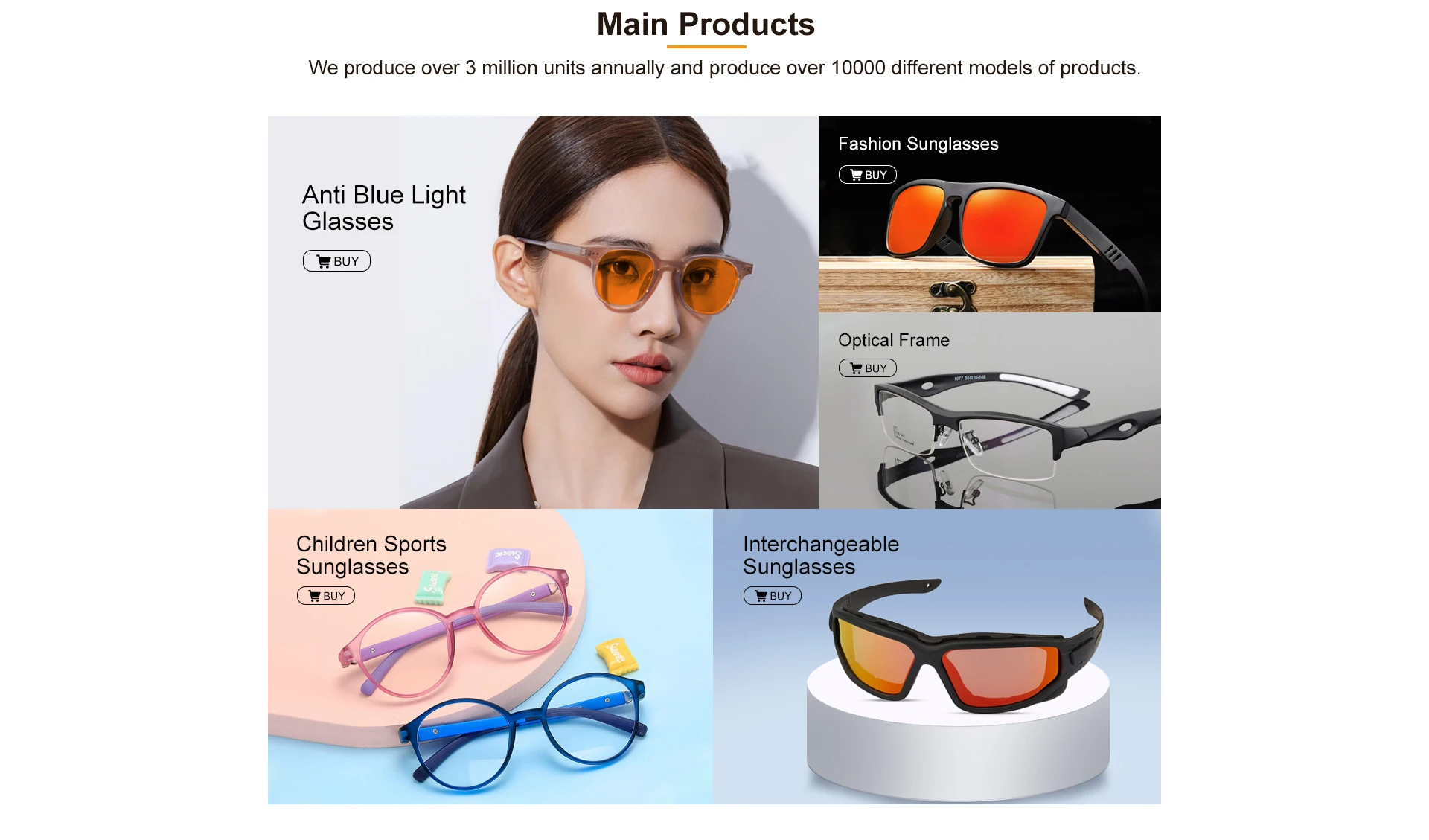 Productos principales:Gafas de sol, montura de gafas, gafas de lectura, parte de gafas, gafas antiluz azul